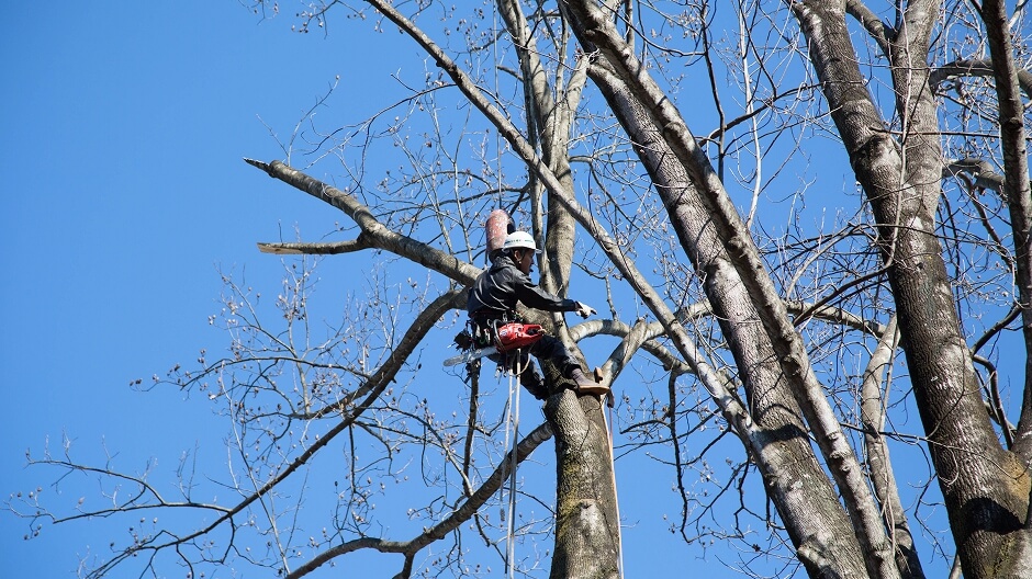 クレーンや高所作業車を使うほか、重機が入れない場所では木に登り、上から少しずつ切り進めます。