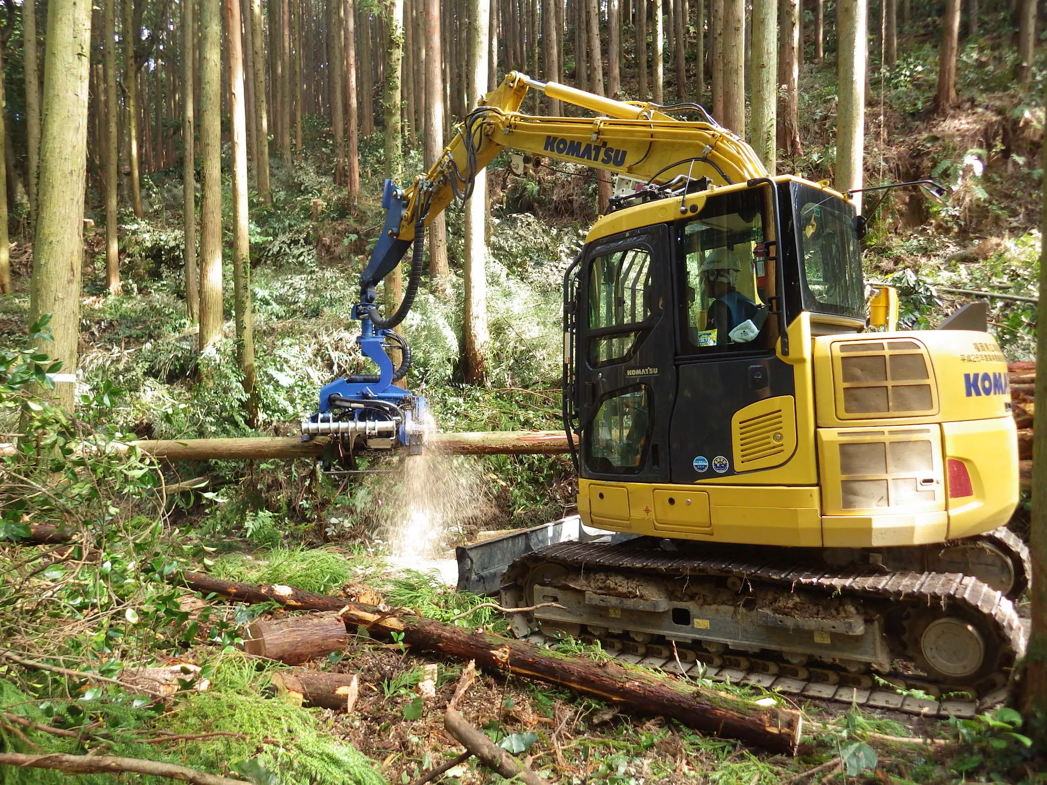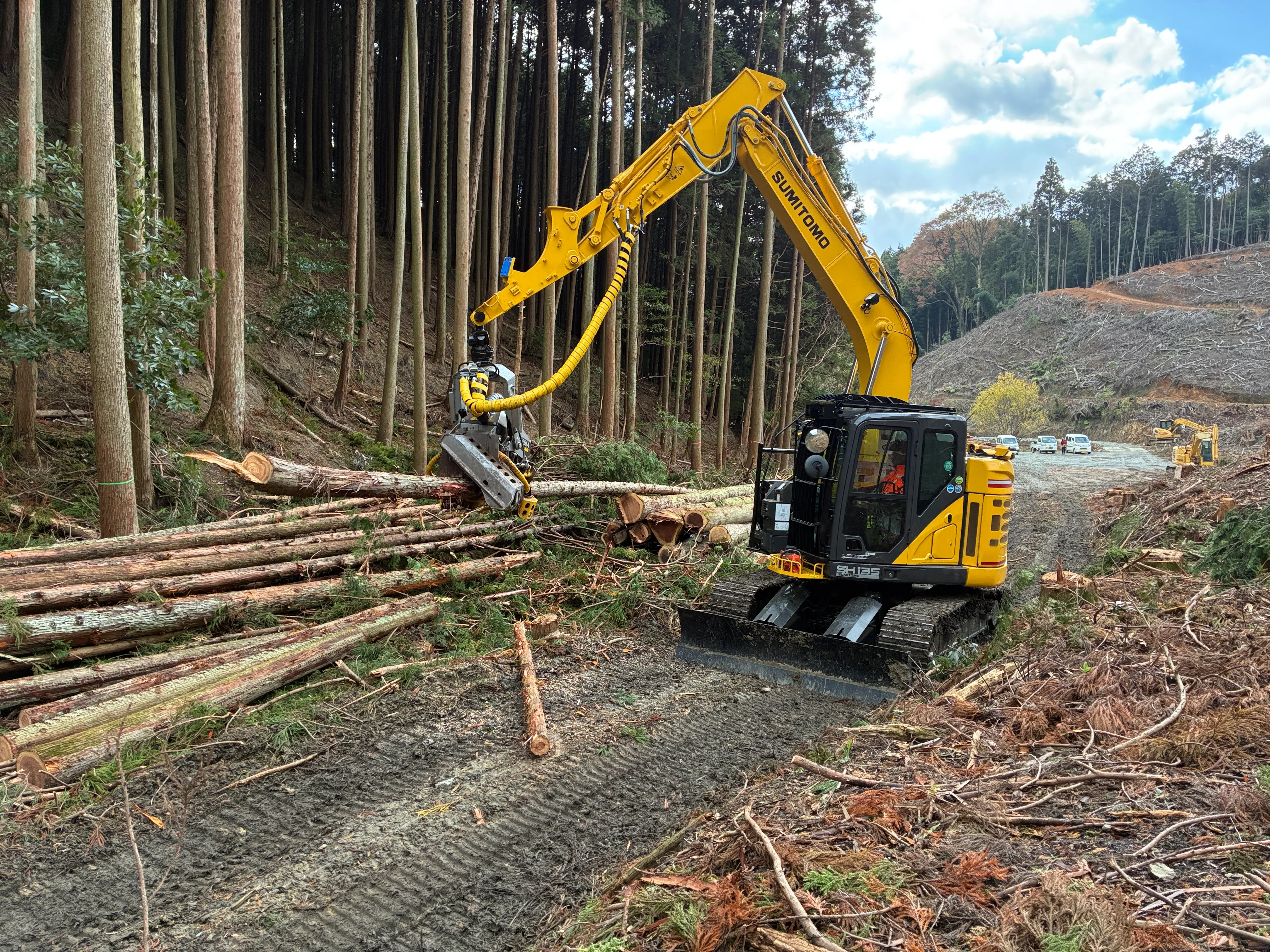 現場は2〜3名の少人数班で行動。声を掛け合いながら、安全第一で作業を進めます。■高性能林業機械を使った作業