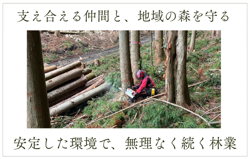当組合では、現場を支える職員と組合員が互いに信頼し合い、それぞれの役割を果たすことで、森林づくりを進めてきました。人と人とのつながりを大切にし、長く安心して働ける組織であることを何よりも重視しています。