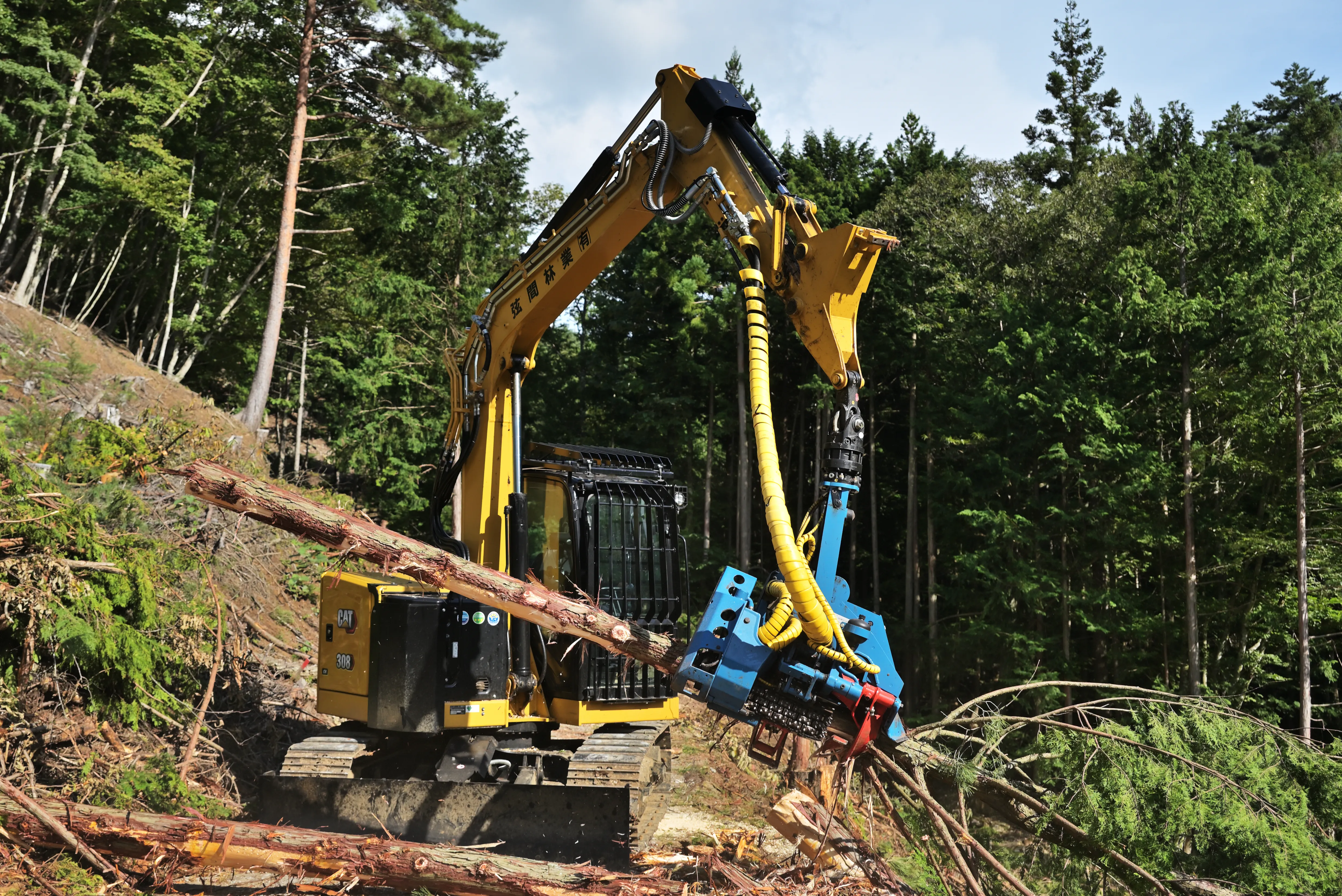 当社は、檜峰神社をはじめとした地域の皆さんに支えていただきながら、森林整備の事業を行ってきました。その後、森林作業道の作設を進め、木材生産の事業を少しずつ行えるようになりました。